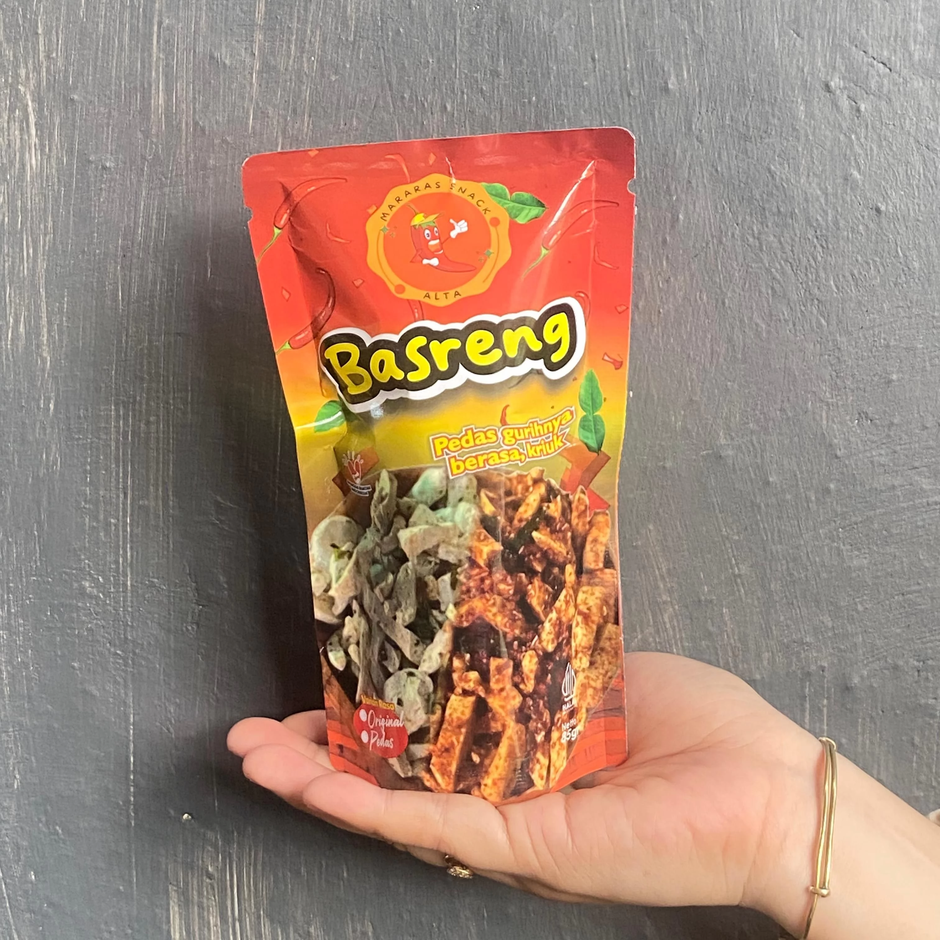 Basreng adalah singkatan dari bakso goreng, camilan khas Indonesia yang berbahan dasar bakso ikan atau daging yang digoreng kering dan diberi bumbu pedas.