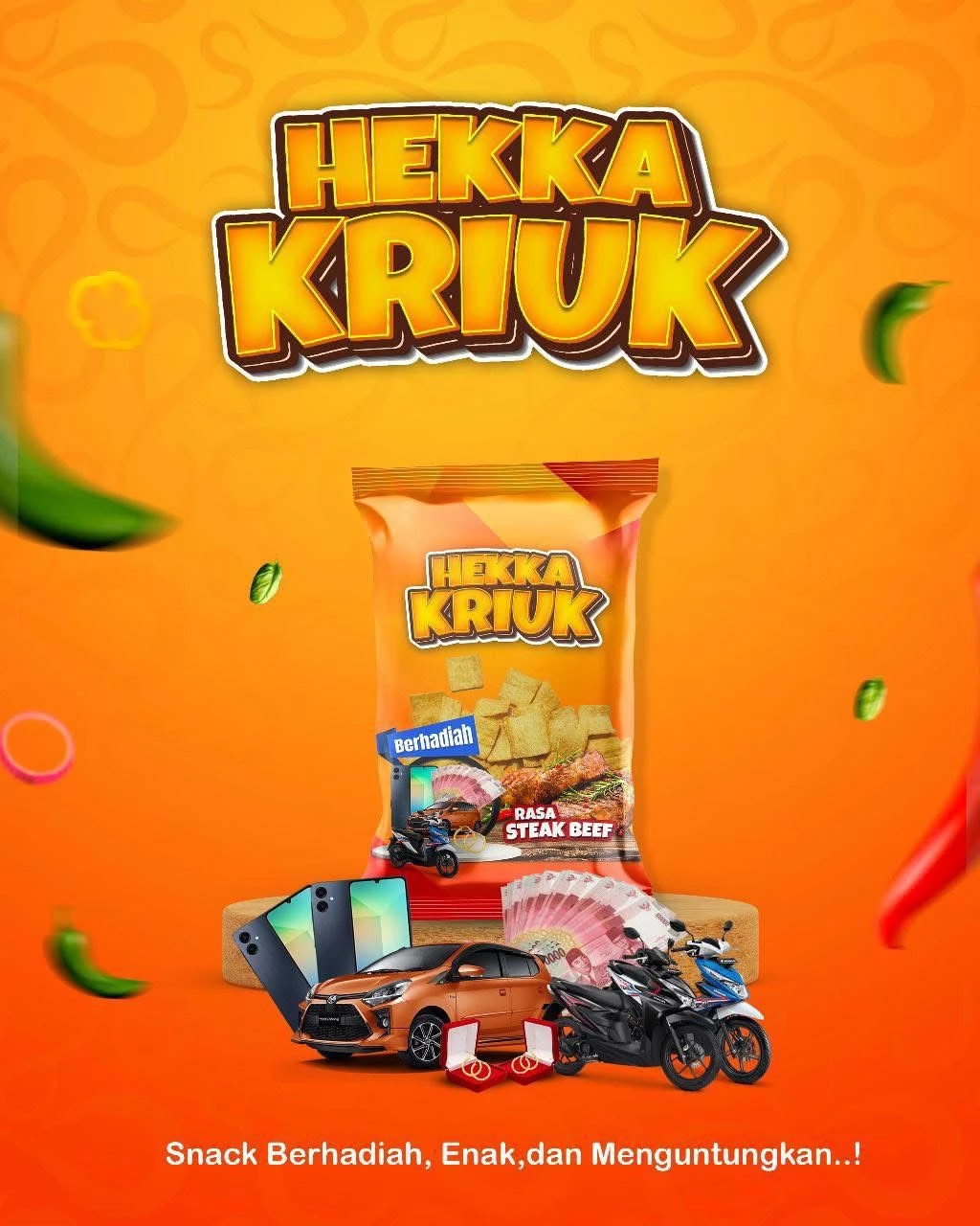 Setiap bungkus Hekka Kriuk bukan hanya memanjakan lidah, tapi juga memberikan kesempatan menang hadiah besar seperti mobil, motor, handphone, uang tunai, hingga paket liburan ke Pulau Bali.